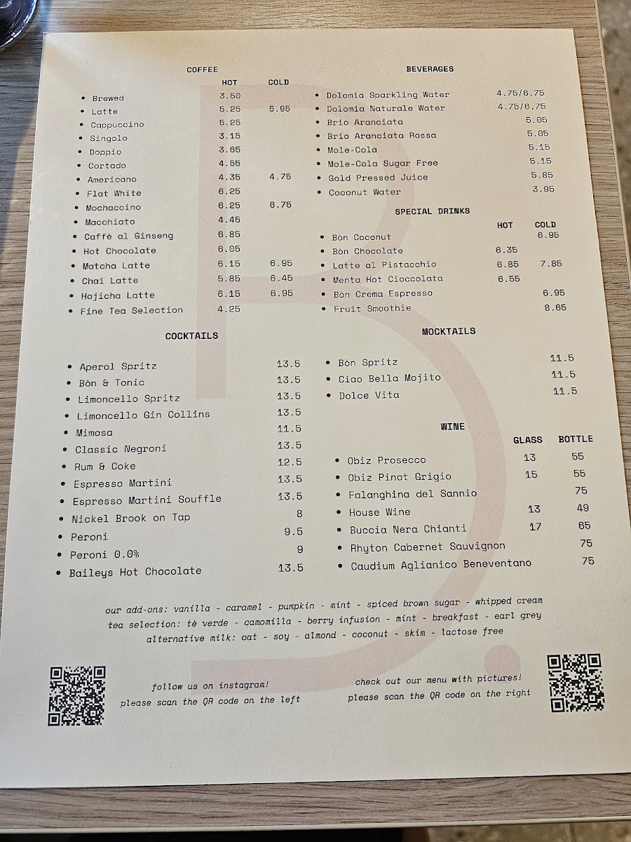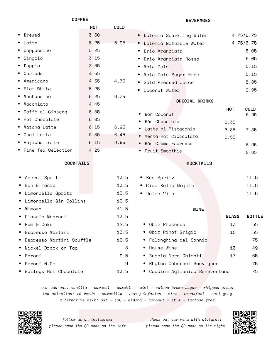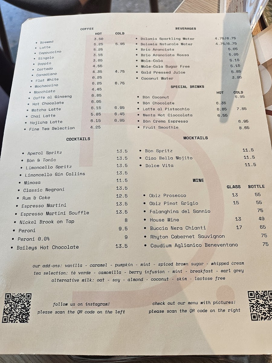 The pastries at Bon Italia are a sweet indulgence, with options like the Nutella Croissant and Bomboloni filling the air with tempting aromas. Pair your meal with a Mochaccino or a Hojicha Latte for the perfect Italian coffee experience.